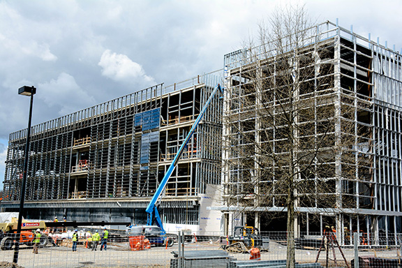SUNY Poly Utica site. 253,000 Square foot technology Complex with clean room. Build subgrade excavation surface for footers. Layout Step footers, piers, and anchors. Plumb Steel columns. Layout floor to floor building plan for carpenters.
