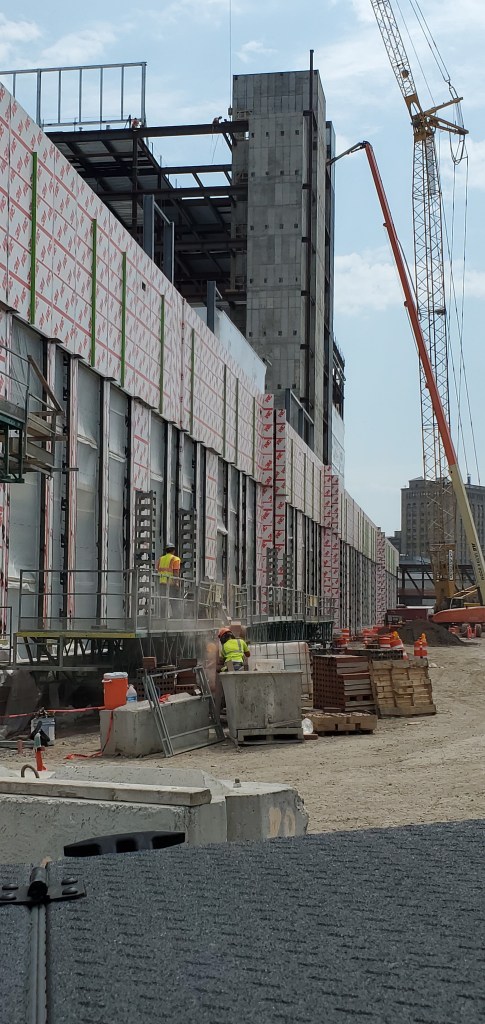 Wynn Hospital in Utica, New York—the region’s first new hospital in more than 30 years. A 10-story healthcare facility required precise coordination across multiple trades and prefabricated building systems. Our scope included anchor bolt and sleeve layout prior to concrete floor pours. We performed detailed layout for prefabricated bathroom units, coordinating the placement of over 30 units per floor throughout the building. Elevator shaft alignment was completed for the Readi-Core system, maintaining strict vertical tolerances. To support efficient trade coordination, we established and transferred survey control to each floor, that allowed individual trades—including carpentry, HVAC, electrical, and others—to self-perform layout with confidence and accuracy.